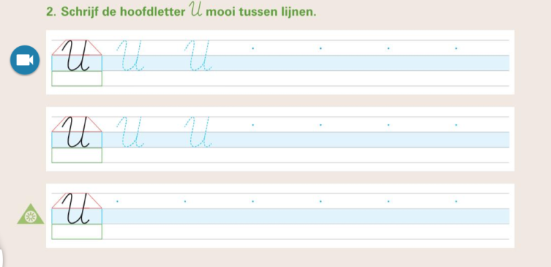 -> Schrijf de hoofdletter U mooi tussen de lijnen. Als je zin hebt, mag je het driehoekje ook maken...