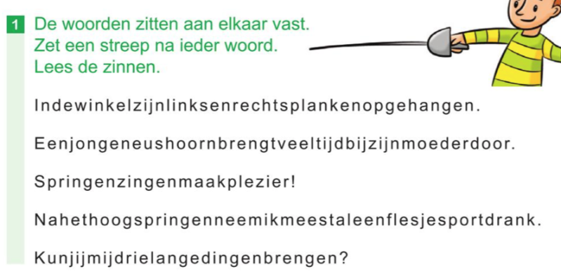 -> De woorden zitten aan elkaar vast. Zet een streep na ieder woord. Lees de zinnen.